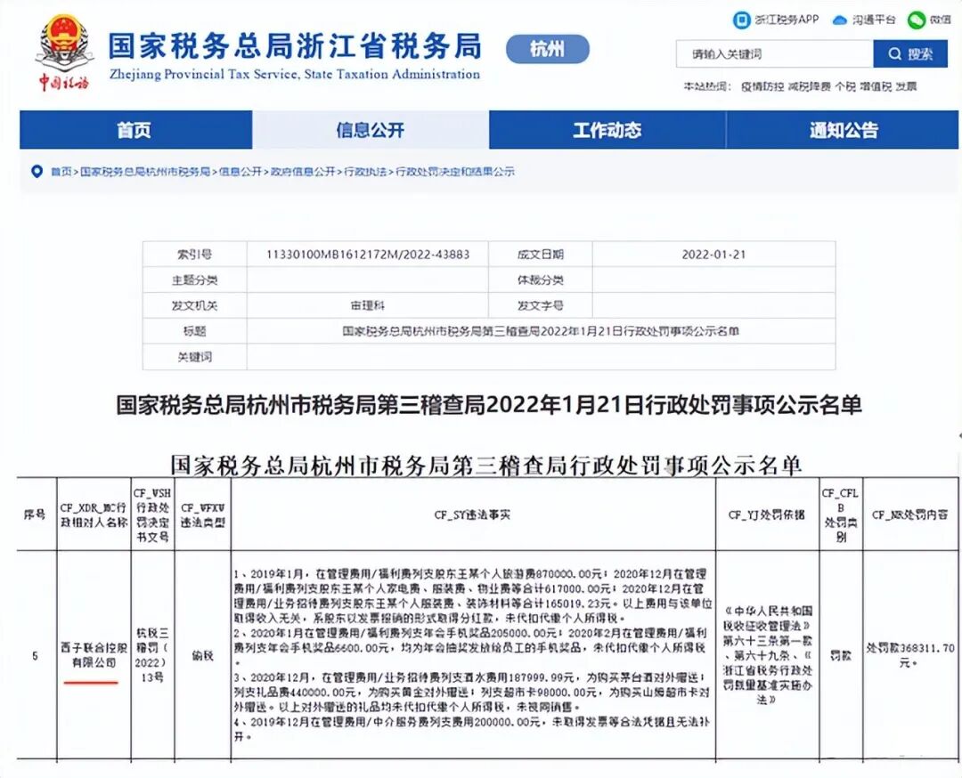 杭州市税务局公布:西子联合控股有限公司因偷税被处罚款368311.7元。